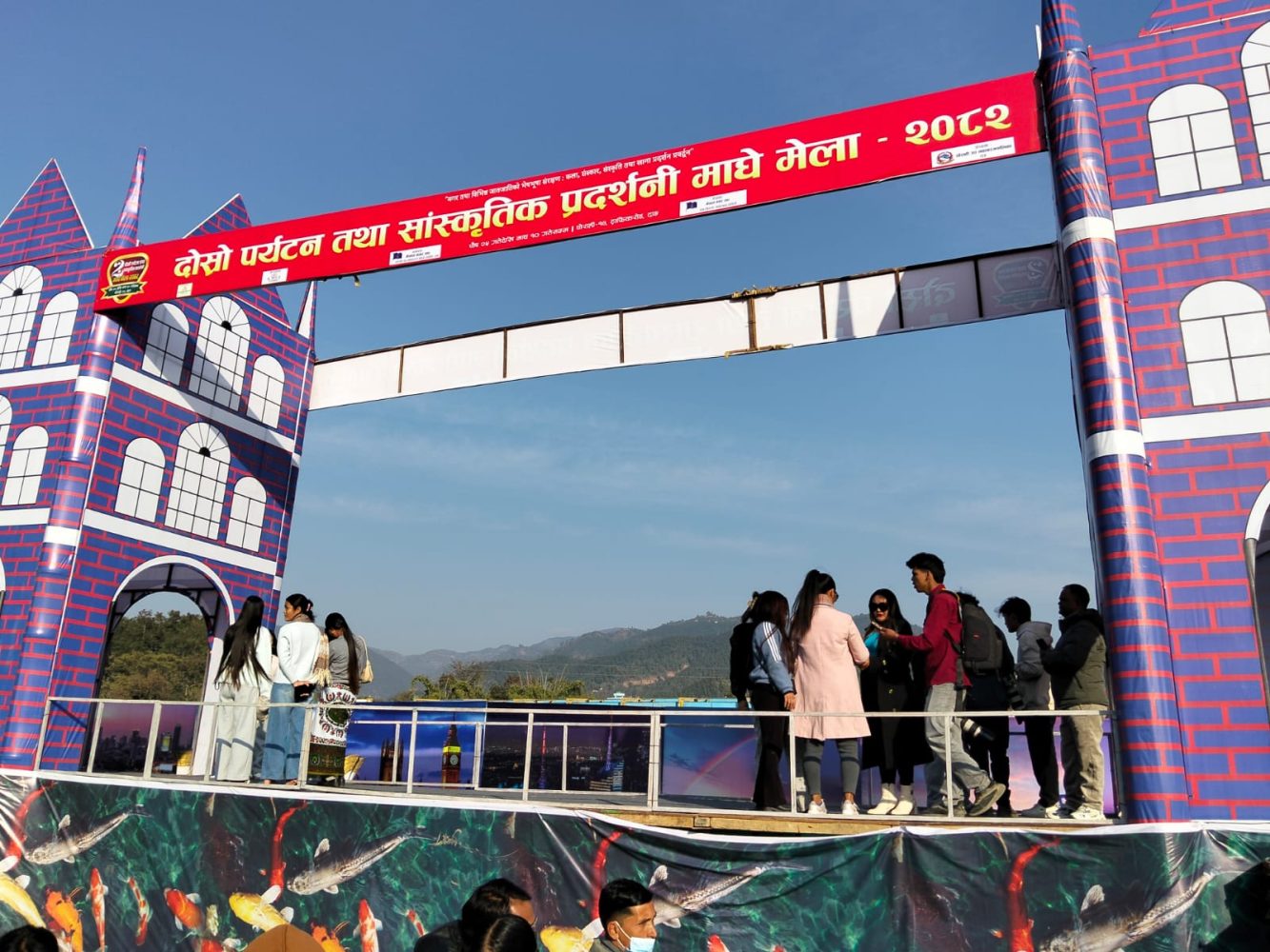 दोस्रो पर्यटन तथा सांस्कृतिक प्रदर्शनी माघे मेला–२०८२ अन्तर्गत निर्माण गरिएको यो प्रवेशद्वार कुनै साधारण गेट होइन । बेलायतको ऐतिहासिक ‘लण्डन ब्रिज’ कै आकृति सम्झाउने गरी तयार पारिएको यो संरचनाबाटै दर्शकहरू मेला परिसरमा प्रवेश गर्छन् । यही कारण, मेला सुरु हुनु अघिदेखि नै यहाँ भीड जमिन थाल्छ-कोही अडिएर संरचनाको बनावट नियाल्छन्, कोही मोबाइल निकालेर तस्बिर र भिडियो खिच्न व्यस्त देखिन्छन् ।