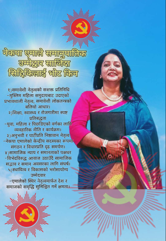 नेकपा (एमाले) को तर्फबाट मुस्लिम कलस्टरको समानुपातिक सूचीमा १ नम्बरमा उम्मेदवार बन्न सफल केन्द्रीय सदस्य साजिदा सिद्धिकीले समावेशी लोकतन्त्र, सामाजिक न्याय र दिगो विकासलाई केन्द्रमा राख्दै आफ्ना मुख्य एजेन्डा सार्वजनिक गर्नुभएको छ। मुस्लिम महिला समुदायबाट उदाएको प्रभावशाली नेतृत्वका रूपमा सिद्धिकीको उम्मेदवारीलाई समावेशी प्रतिनिधित्वको महत्वपूर्ण उपलब्धिका रूपमा हेरिएको छ। साजिदा सिद्धिकीले समावेशी नेतृत्वको सशक्त प्रतिनिधिका रूपमा आफूलाई प्रस्तुत गर्दै मुस्लिम महिला समुदायसहित सबै पिछडिएका वर्गको आवाज नीति निर्माण तहसम्म पुर्याउने प्रतिबद्धता व्यक्त गर्नुभएको छ। उहाँले समावेशी लोकतन्त्र केवल नारामा सीमित नराखी व्यवहारमै कार्यान्वयन हुनुपर्नेमा जोड दिनुभएको छ।